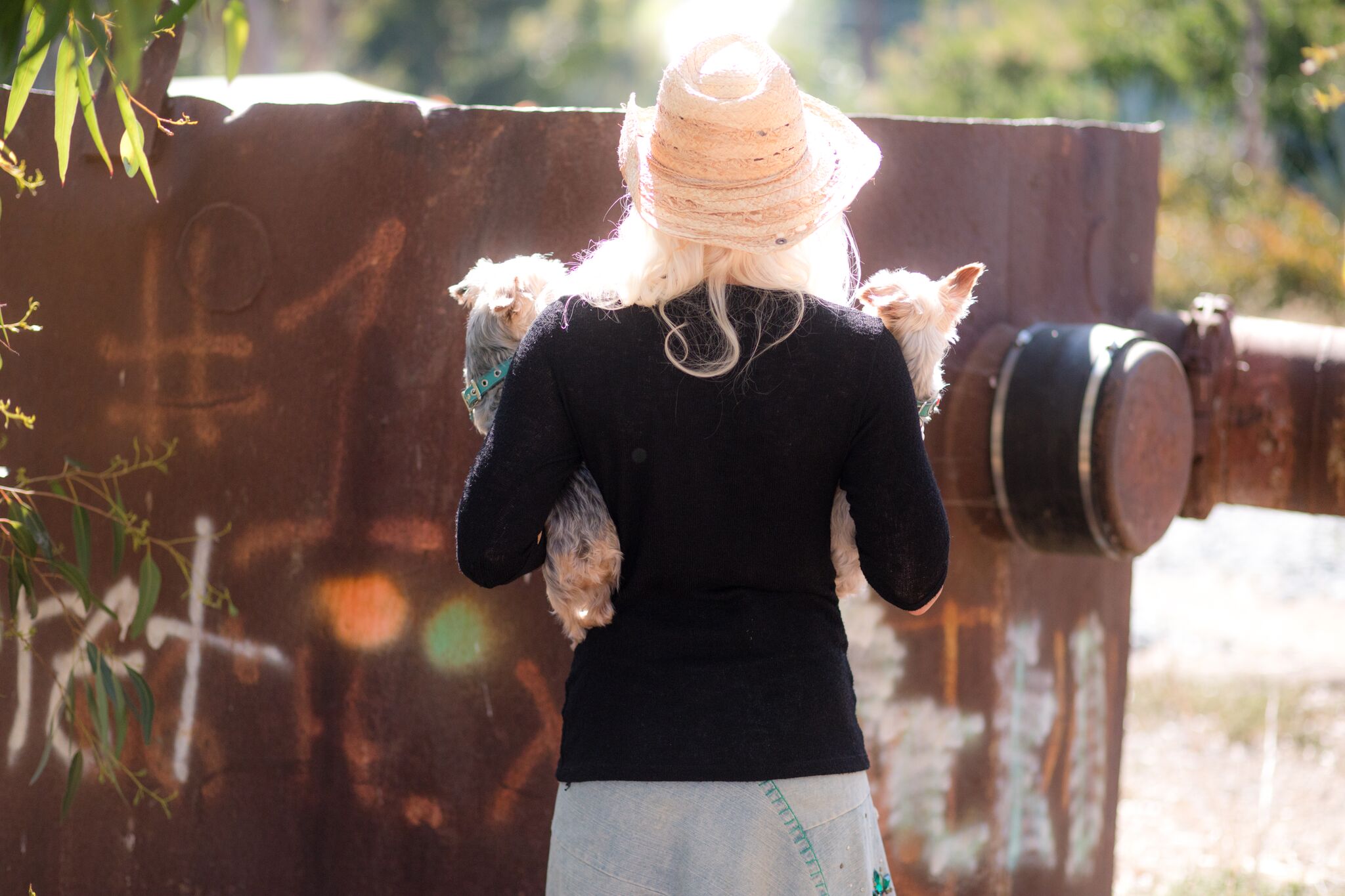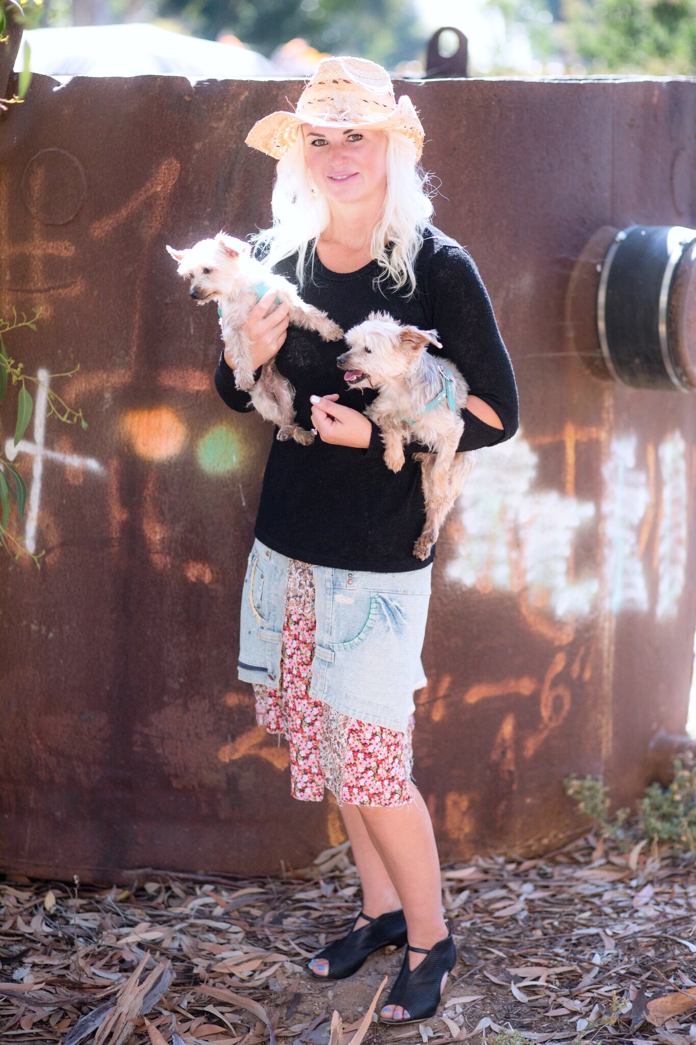 What do you think? With two perfect yorkies, a sweater with ripped elbows, a torn and bejewled funky jean skirt, high heeled half boots and a cowgirl hat?
