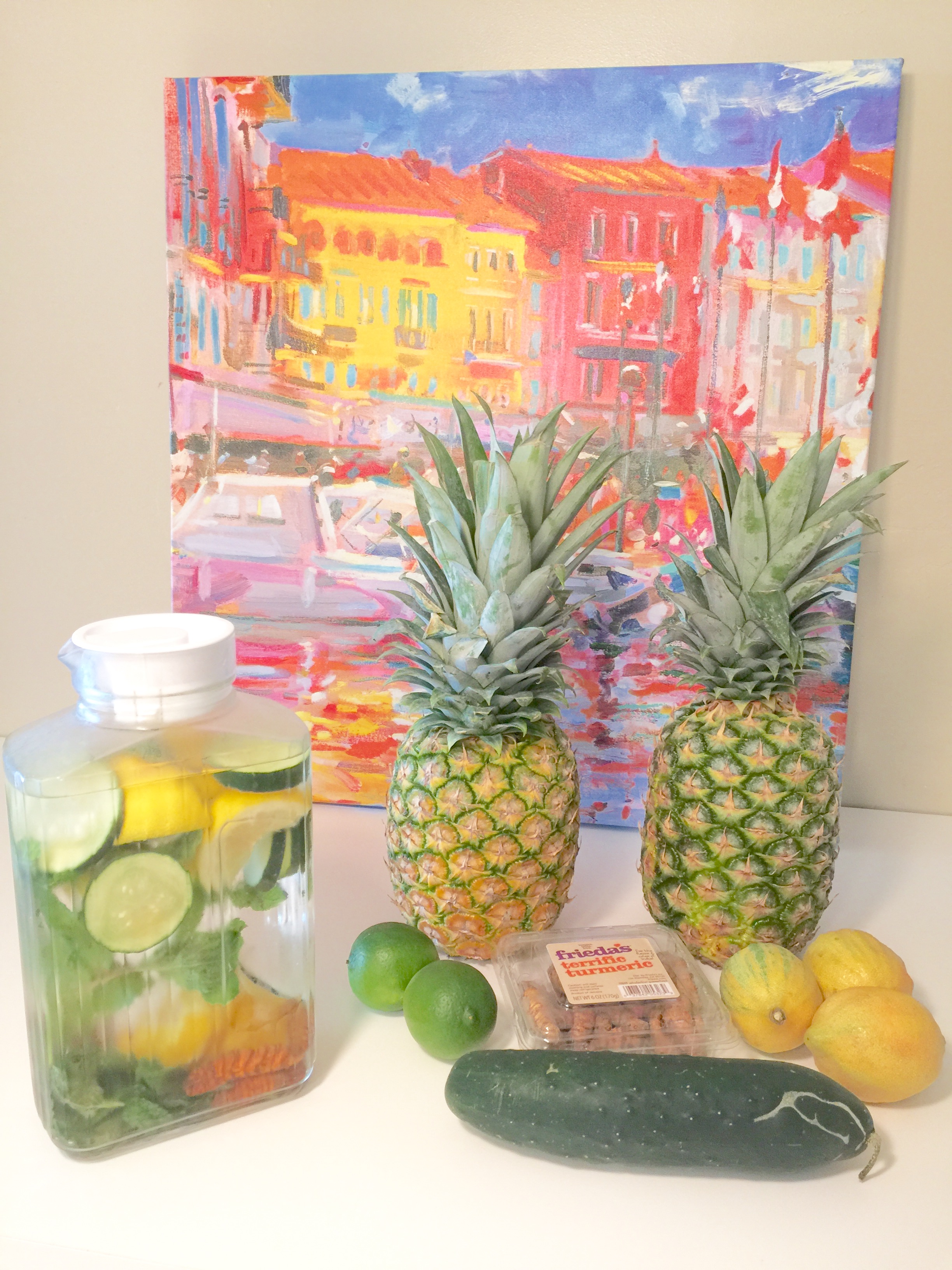 Just looking at these ingredients seems to tone down my puffiness, literally. Cucumber, pineapple, lemons and limes, turmeric and filtered water. YUM. Who wouldn’t like this infusion?