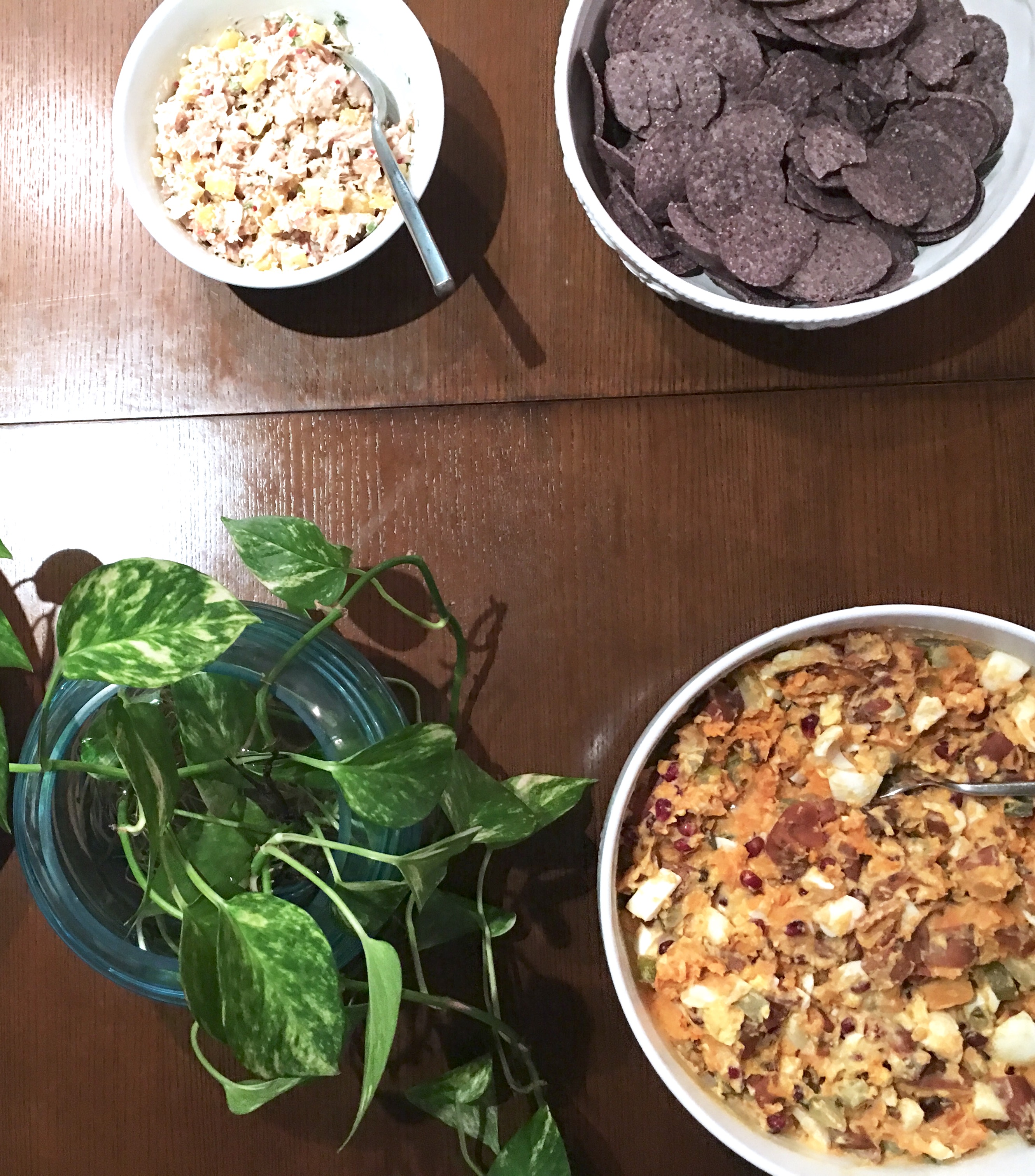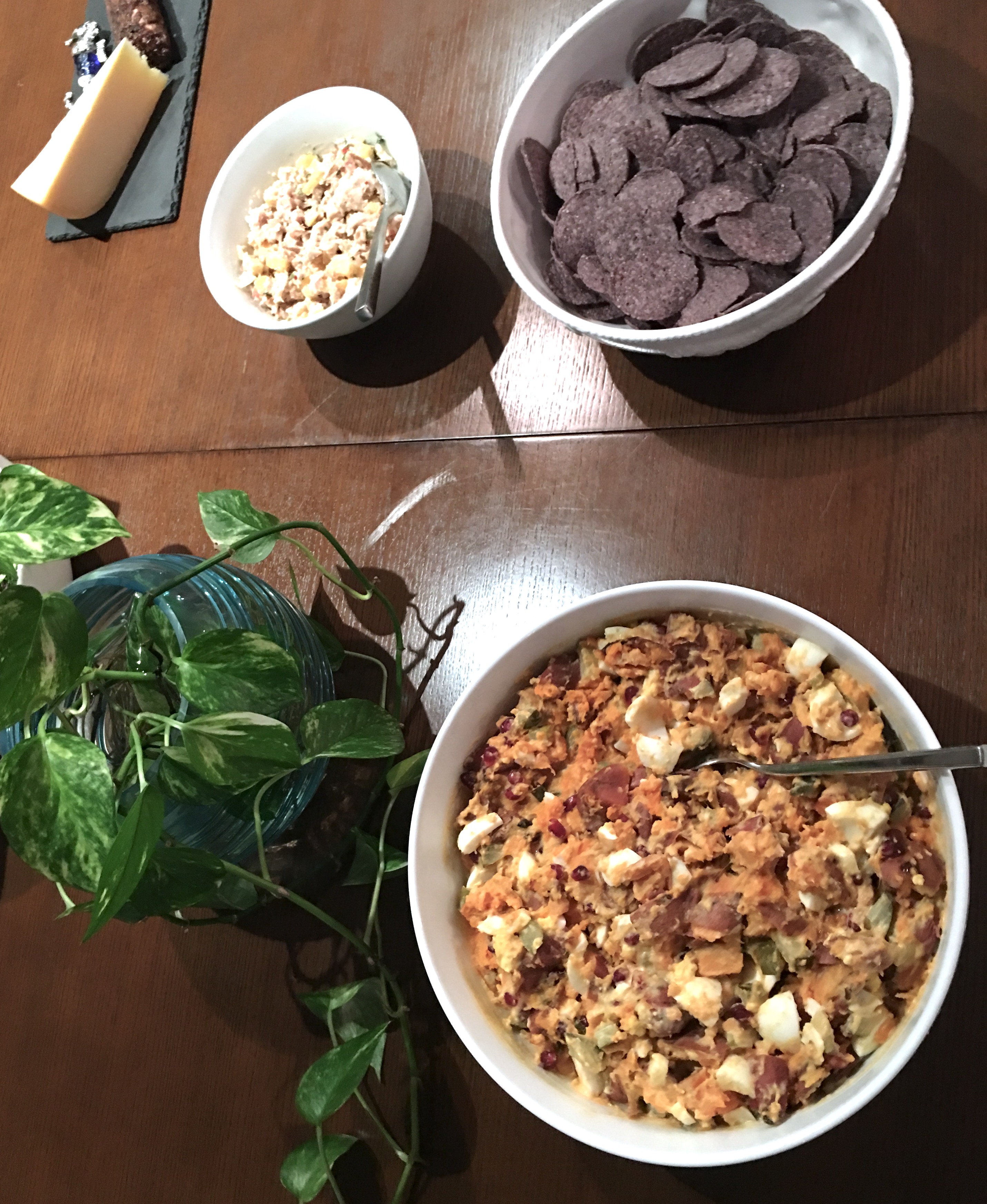 TRY IT. I love grazing on healthy party food. You can’t put weight on if you’re mixing it up with carrots and shrimp, cheeses and of course, my potato salad.