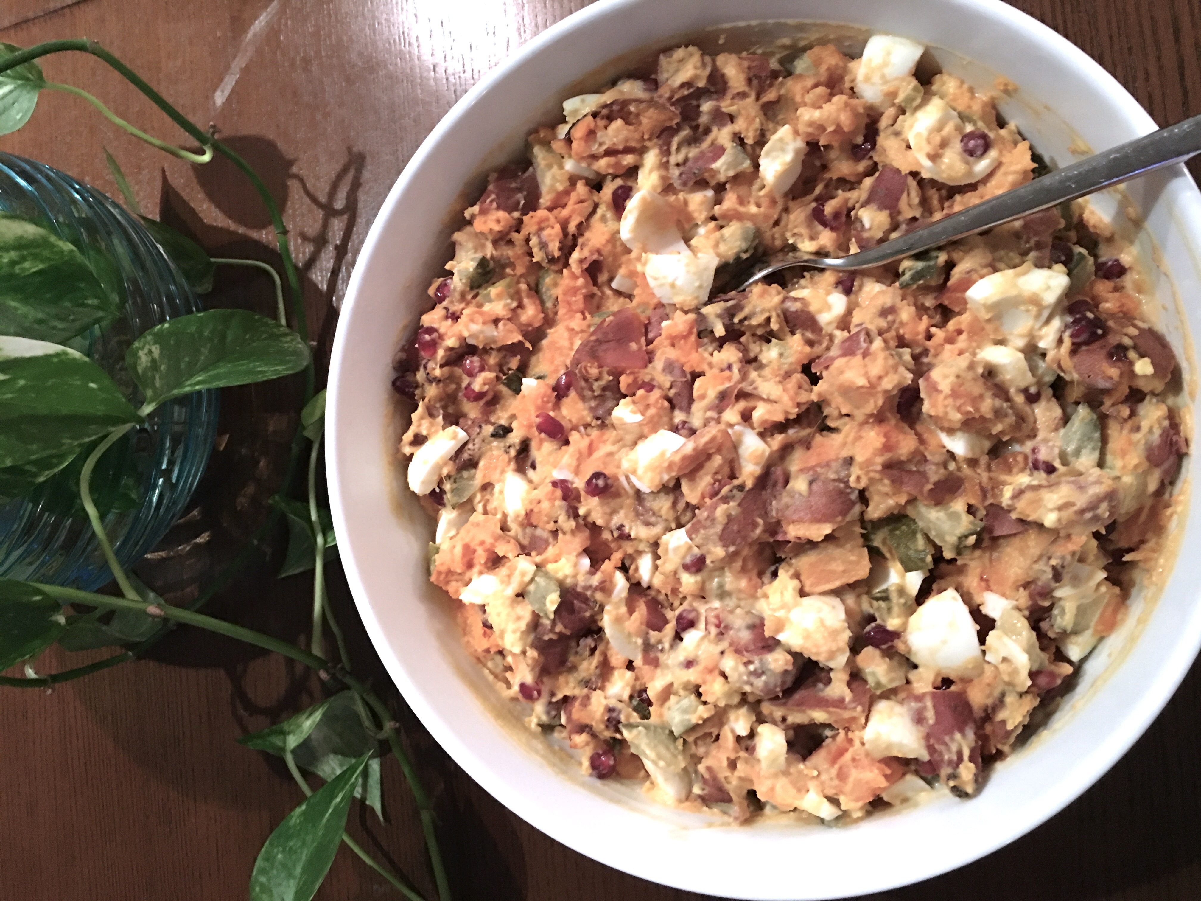 *** Chop your sweet potatoes and place in a large bowl, skins and all. Add your pickles, pomegranates and chopped egg. Stir in your vegan mayonnaise. If you want to make it creamy but with less calories I suggest a little drizzle of olive oil to soften it up. Tastes great! Serve warm or refrigerate for a colder version. YUM.
