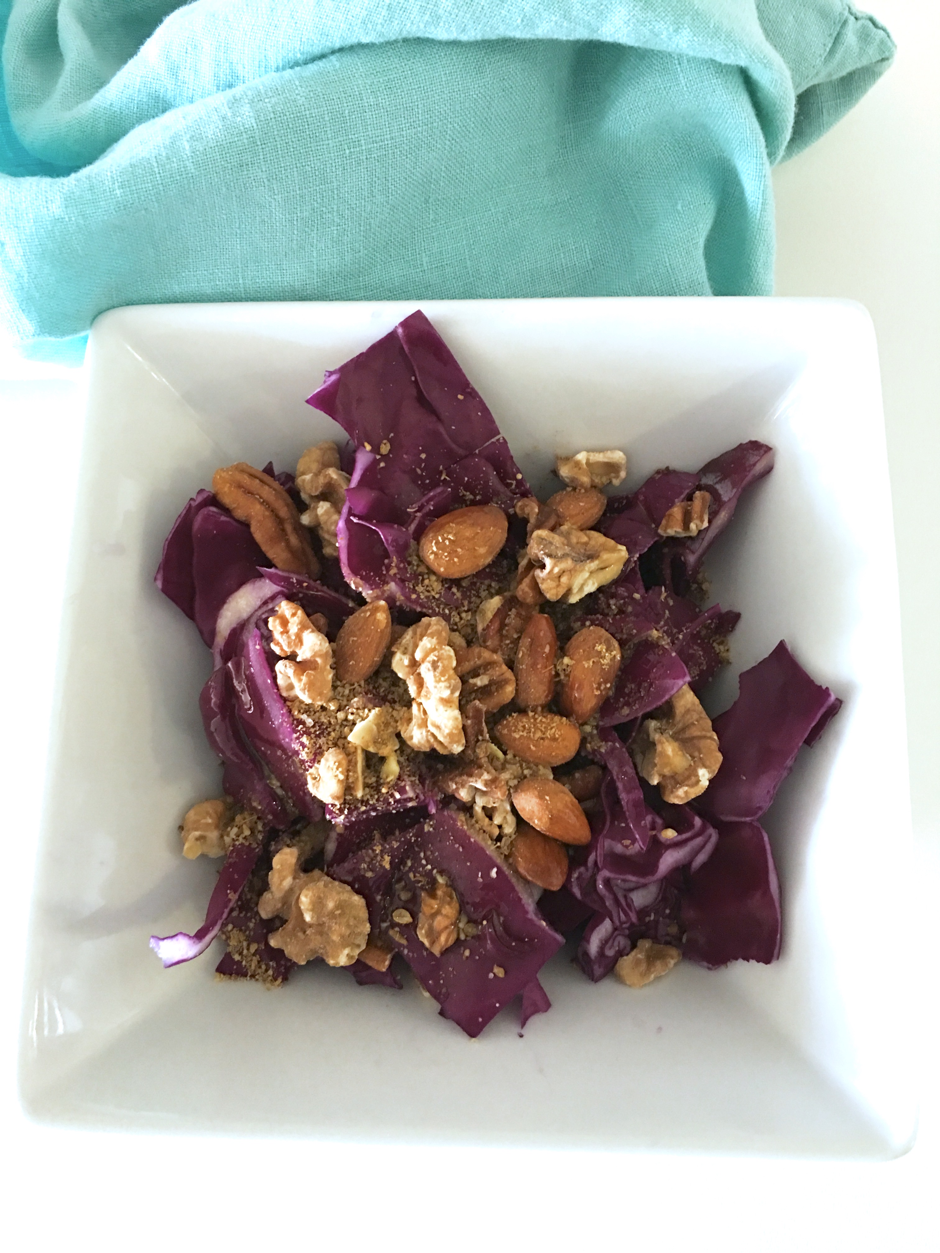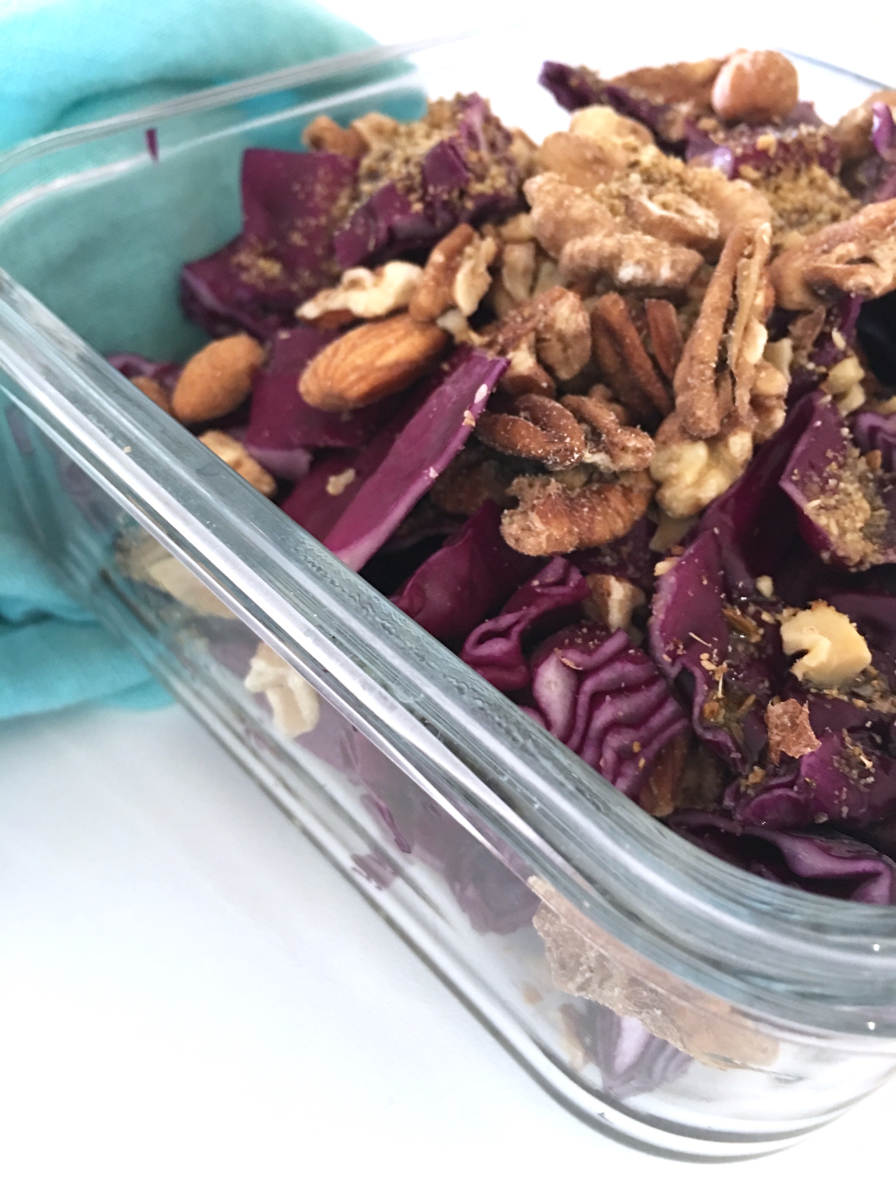 *** Place cabbage in a bowl and drizzle your olive oil. Next add your spices and follow with nuts. Gently stir, place in your glass to-go containers for the week and you’re set! Makes 8-10 servings of large, yummy salads for the week.