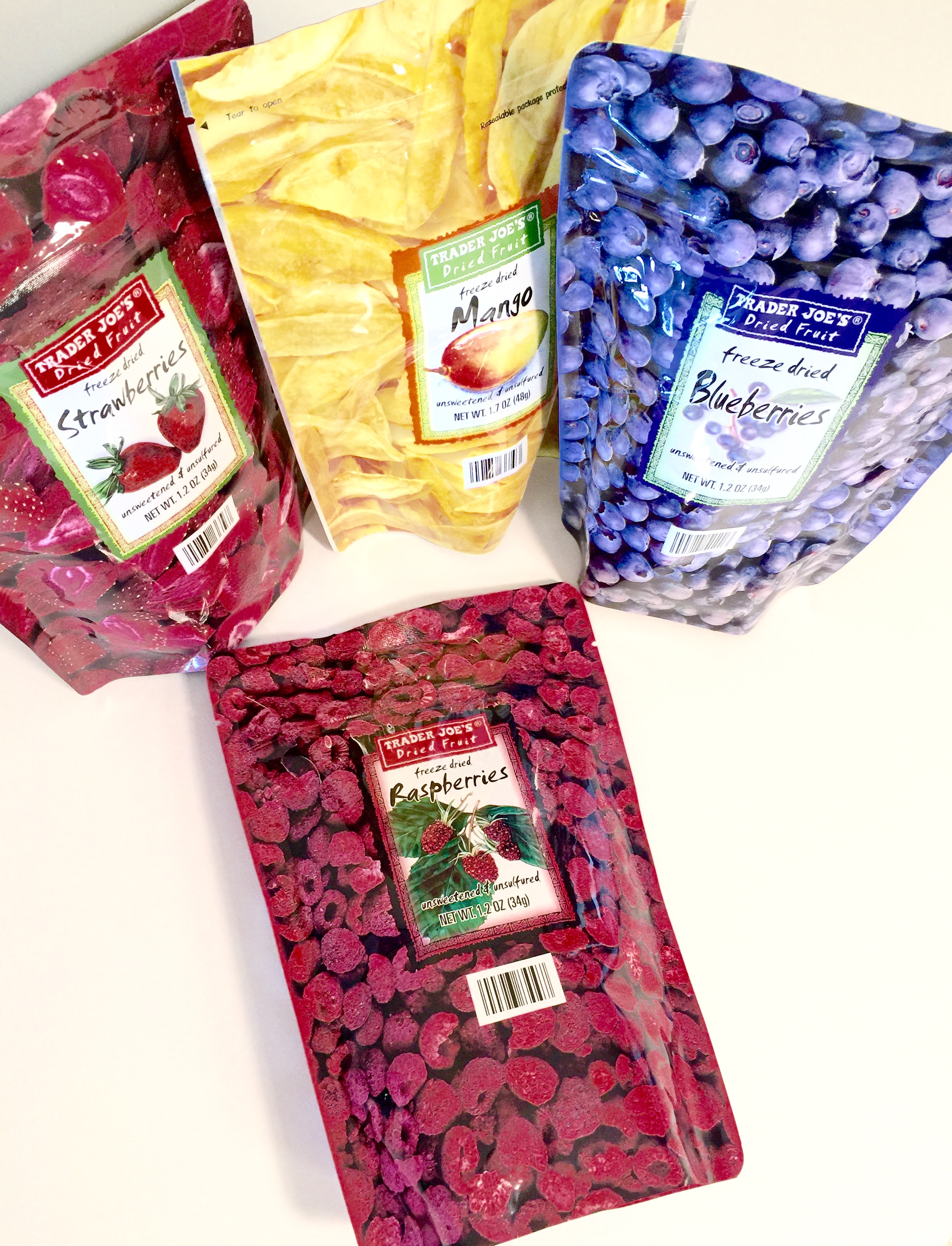 My cousin teases me because I like a clean, simple salad with my main choice of dressing a Greek olive oil (from TJ’s of course). So it’s kinda fun to spice up my salads with this variety of freeze dried fruits. Check out the nutrition facts on the back and see for yourselves! Freeze dried is WAY BETTER than regularly dried fruits. The strawberries I’ll even eat by themselves as a yummy snack between classes. It curbs the sugar cravings so we stay away from candy!