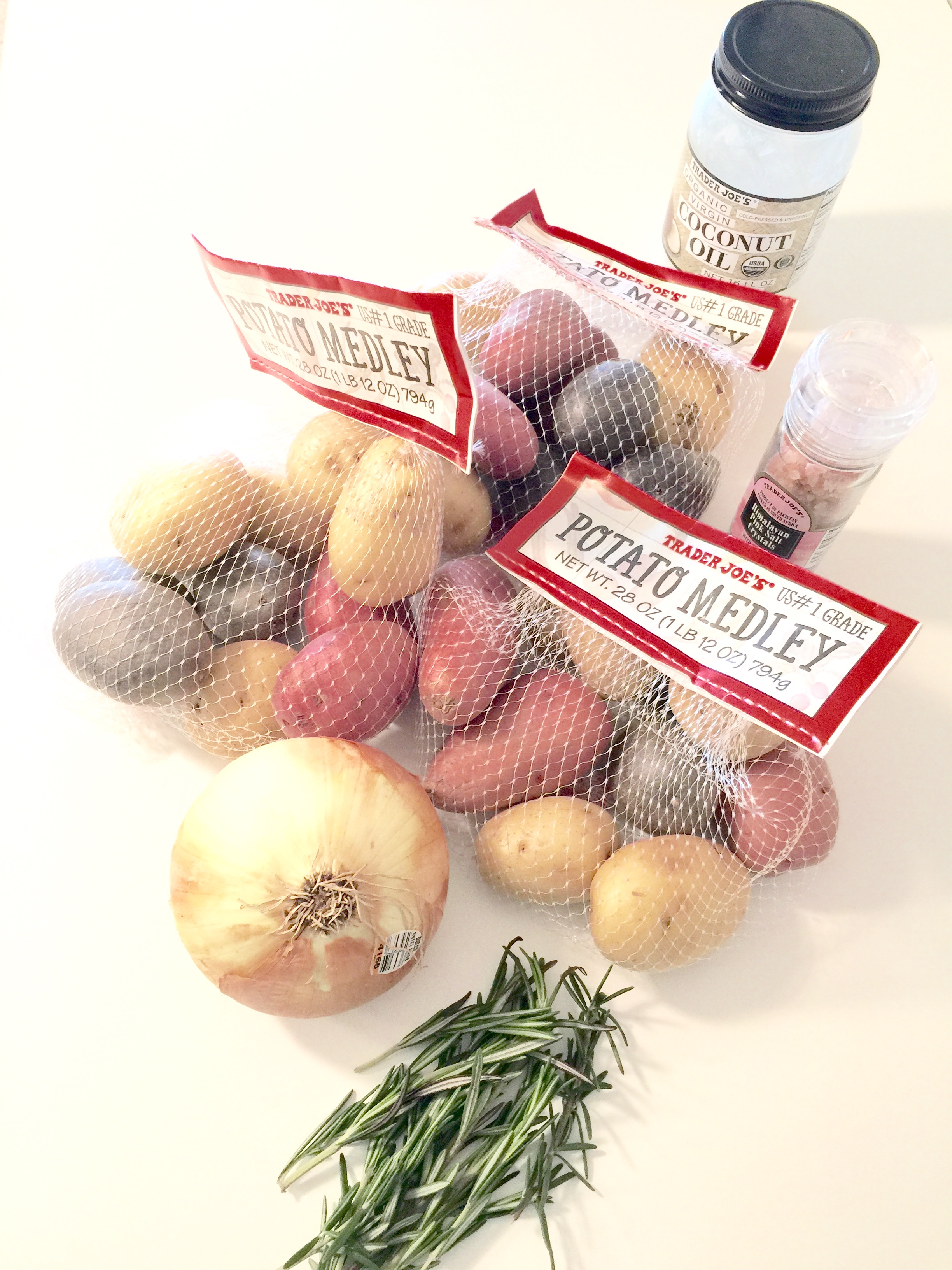 So I have to credit Anton on this one gang. He makes the best potatoes I’ve ever tasted! And all our ingredients come straight from Trader Joe’s. Colorful potatoes, coconut oil, rosemary and sweet onion is all you need. Light up the grill and prepare to be amazed! Btw Anton is always fascinated with how many potatoes I can actually eat in one sitting- definitely one of those entire bags for sure ha ha.