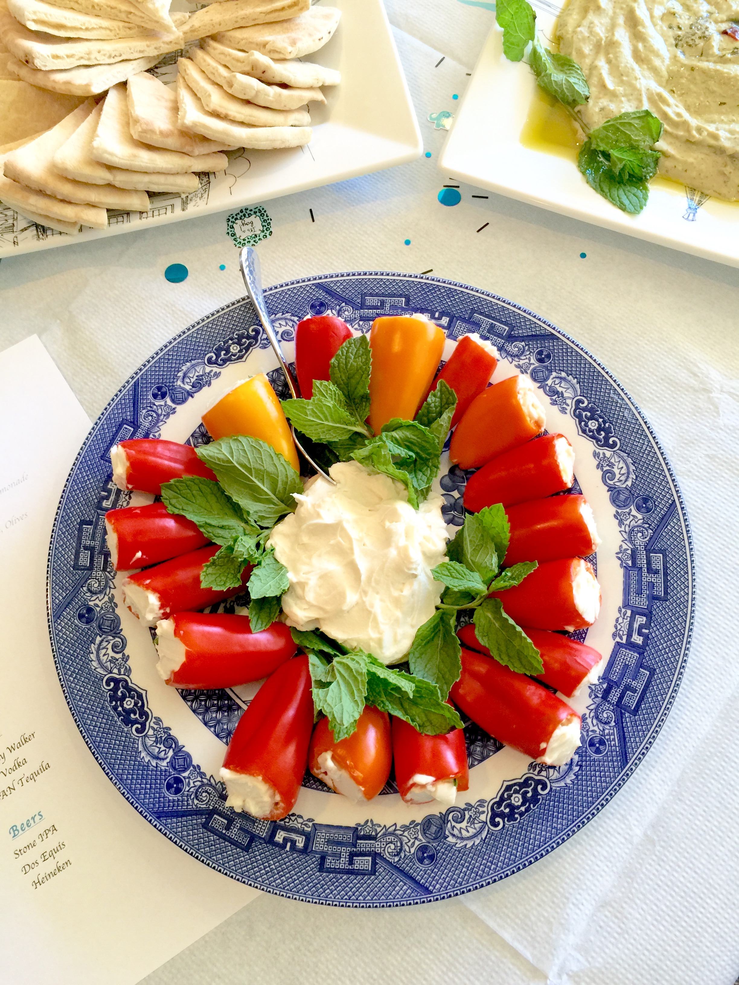 For a party, grab a nice party platter and arrange the peppers in rows of a circle, as I have done above. Place any excess vegan cream cheese in the center of the peppers and decorate with mint leaves. Drizzle extra Virginia olive oil over the excess vegan cream cheese. Serve and enjoy!