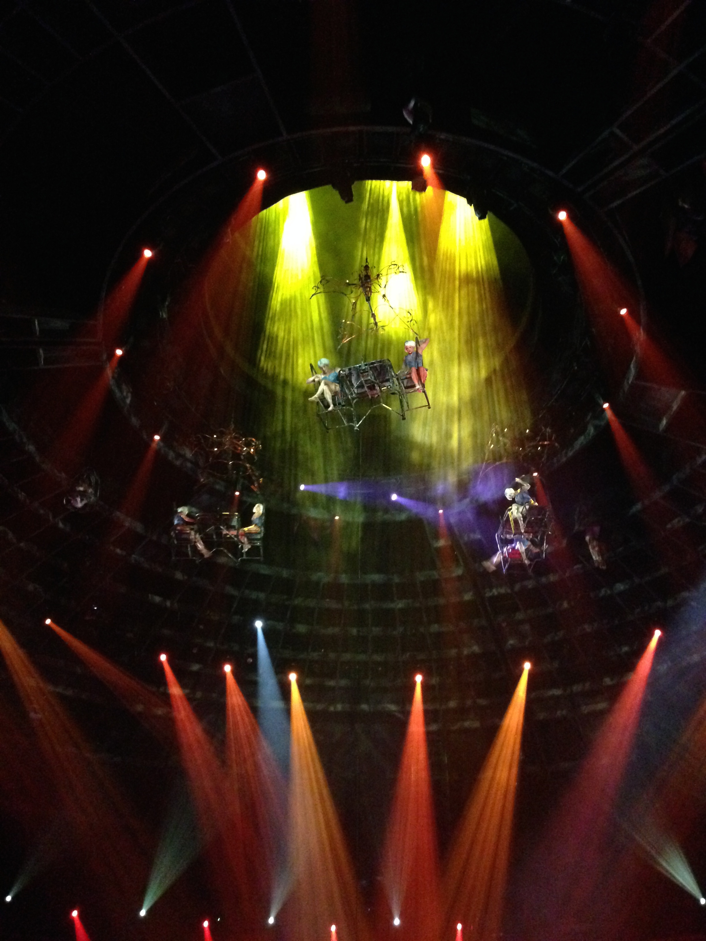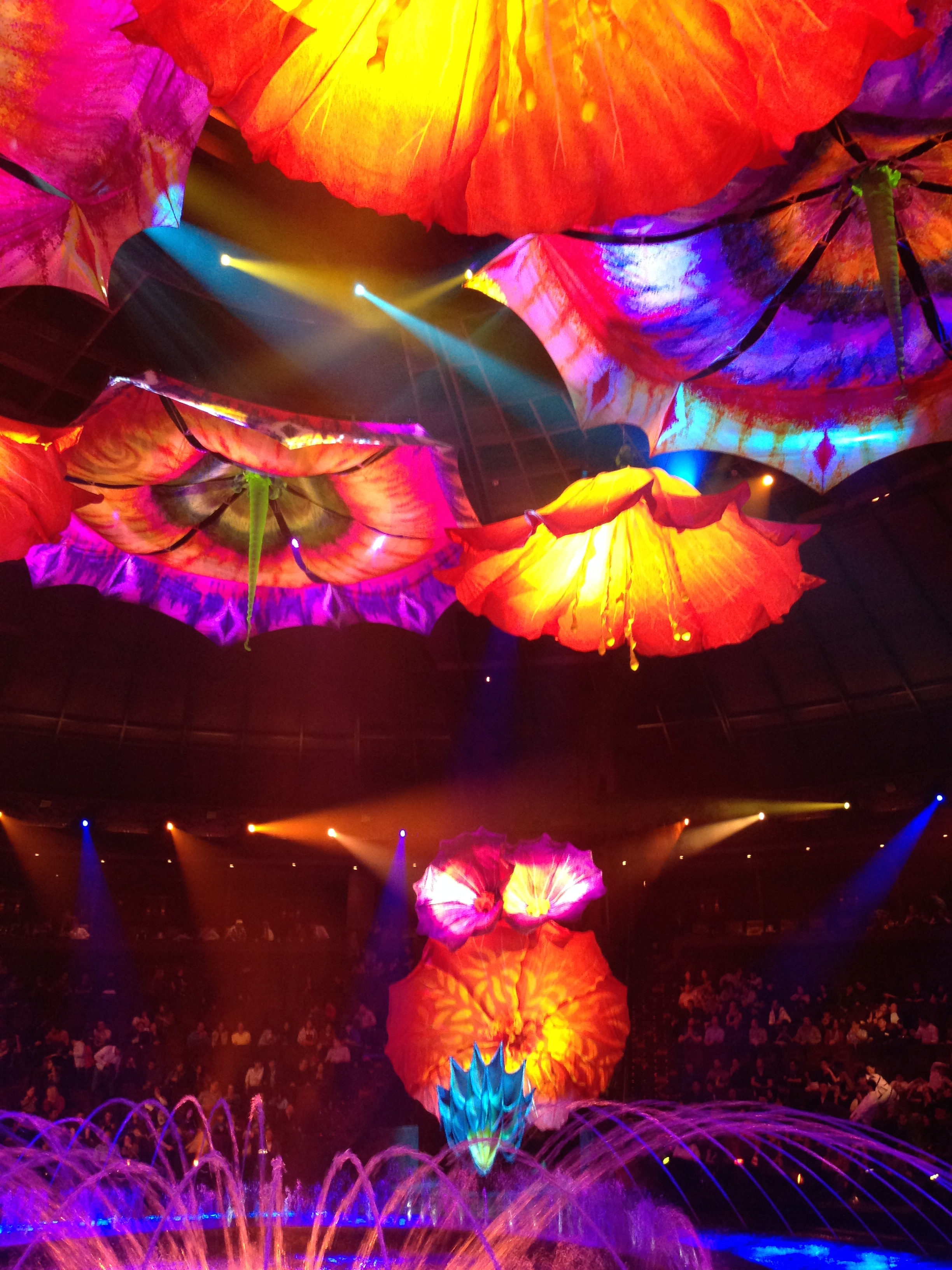 Let’s get back to the show- it’s AMAZING! I mean, in all seriousness, these acrobats are crazy talented! They’re diving over 80 feet into a pool, swinging from trapezes and performing synchronized swimming routines. Then, when the stage emerges from out of that same pool, they begin to ballroom dance. How cool is that?!! I was on the edge of my seat praying that the stage continued to operate efficiently and timely enough so no one hit it on their way down (there goes the control freak side of me- I’d never be able to perform in a show like that, relying on OTHER THINGS to keep me safe).